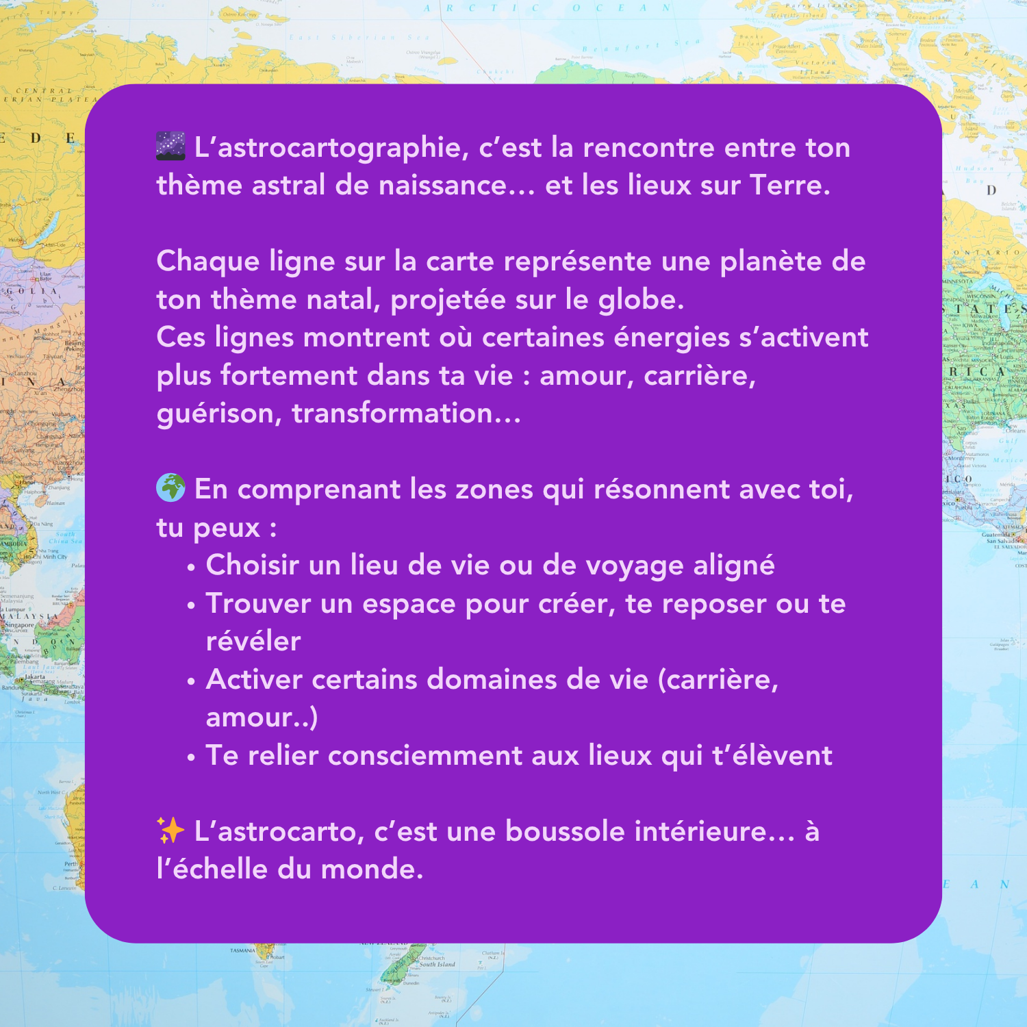 Grâce à cette lecture astrocartographique, découvre les énergies qui s’activent dans les lieux qui t’appellent. Tu recevras une analyse astrocartographique par écrit au format PDF pour t’aider à choisir avec clarté le lieu le plus aligné avec tes envies et projets du moment.